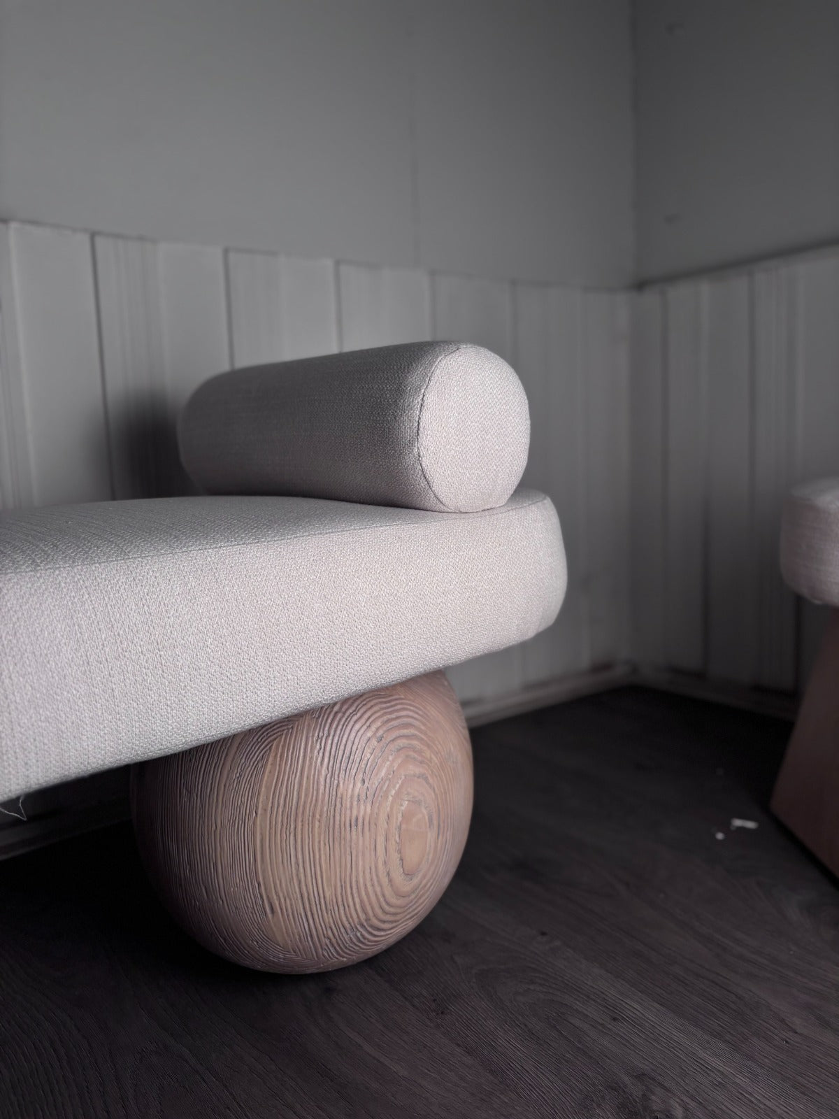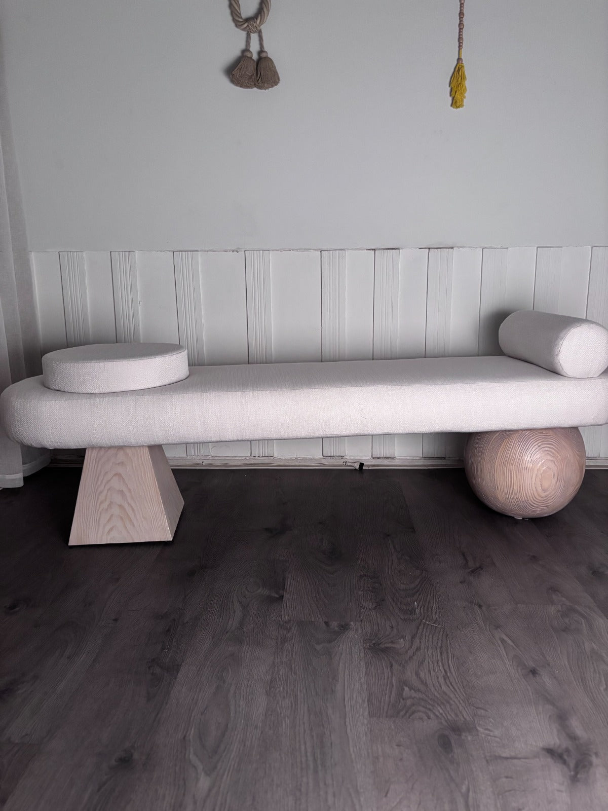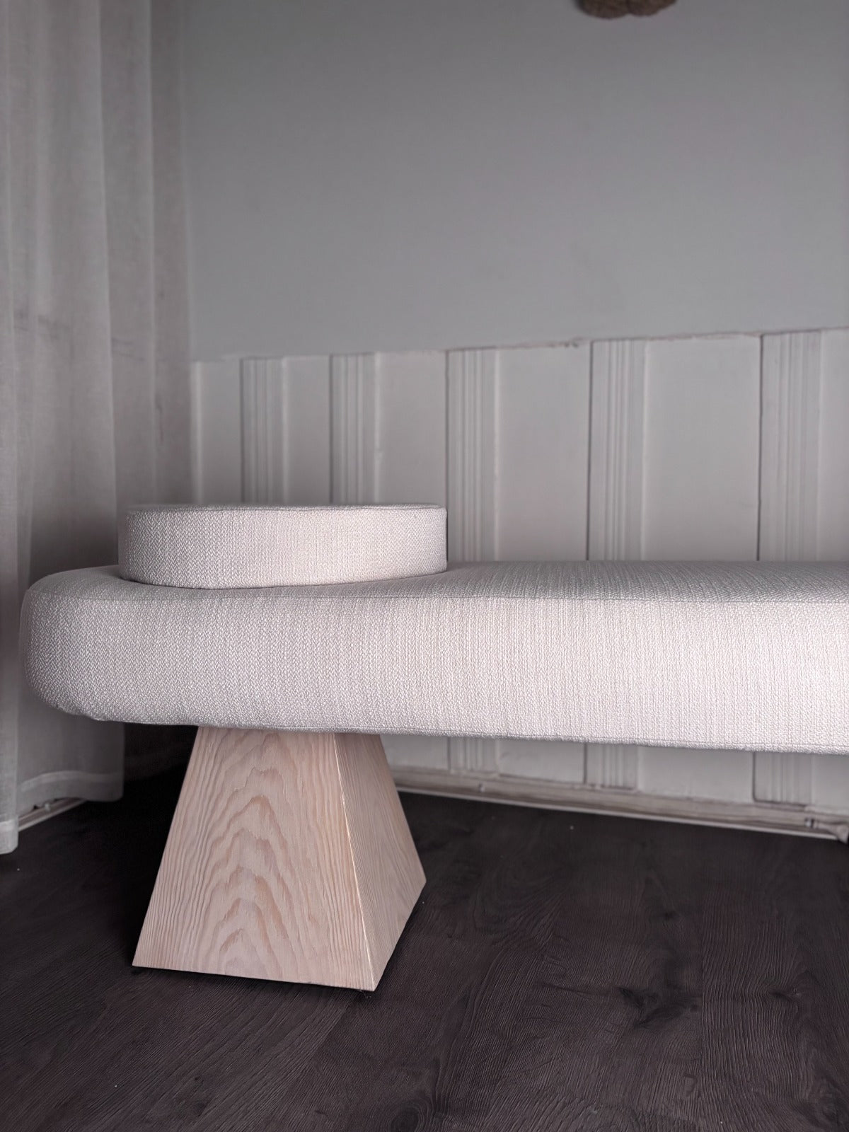 A perfect blend of bold structure and soft texture, the Geometric Bench brings modern charm to any space. Crafted from solid Pitch Pine, its clean lines and sturdy build offer timeless appeal, while the bouclé-upholstered seat adds a cozy, tactile contrast.